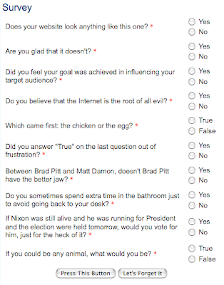 I am putting together a template for a low-budget site at the moment and it seems that folks would like to collect metrics and opinions from visitors. I don’t think long-winded surveys accomplish anything from uncommitted visitors anyway, but I needed to fill in my page, so, here’s what I did: