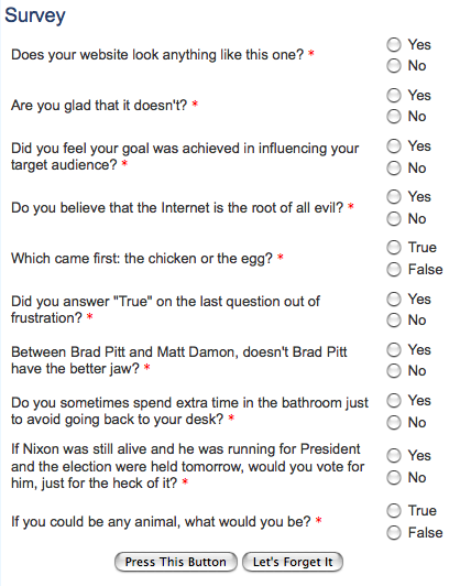 I am putting together a template for a low-budget site at the moment and it seems that folks would like to collect metrics and opinions from visitors. I don’t think long-winded surveys accomplish anything from uncommitted visitors anyway, but I needed to fill in my page, so, here’s what I did: