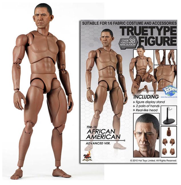 Although the marketing material doesn’t seem to refer to Obama as being the model for Model TIM-15, African American, Advanced Ver., he does have, according to the description, a “real-like head”. Personally, I think his feet are too small. There are also two sets of hands included, one pair suitable “for holding a gun” and a different style of neck. Also, wait, get this, the thigh muscles are removable. Suggested retail? About 38 bucks. That’s one dollar for each of the figure’s 38 points of articulation. Boy, oh, boy, but the Tea Partiers are gonna have fun with this one. And yes, I put in my pre-order . . . I can’t wait till the Michelle version comes out!